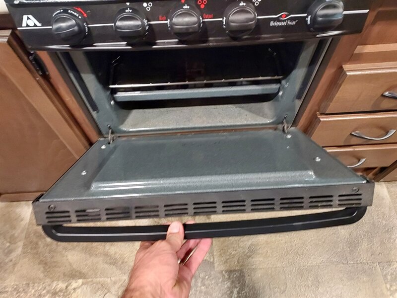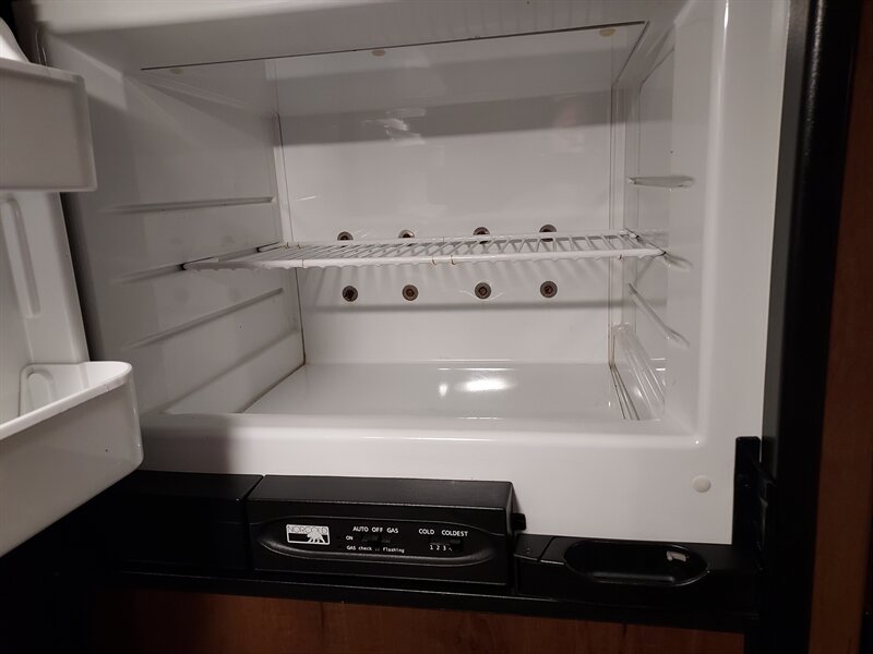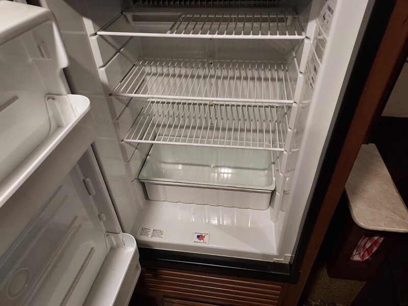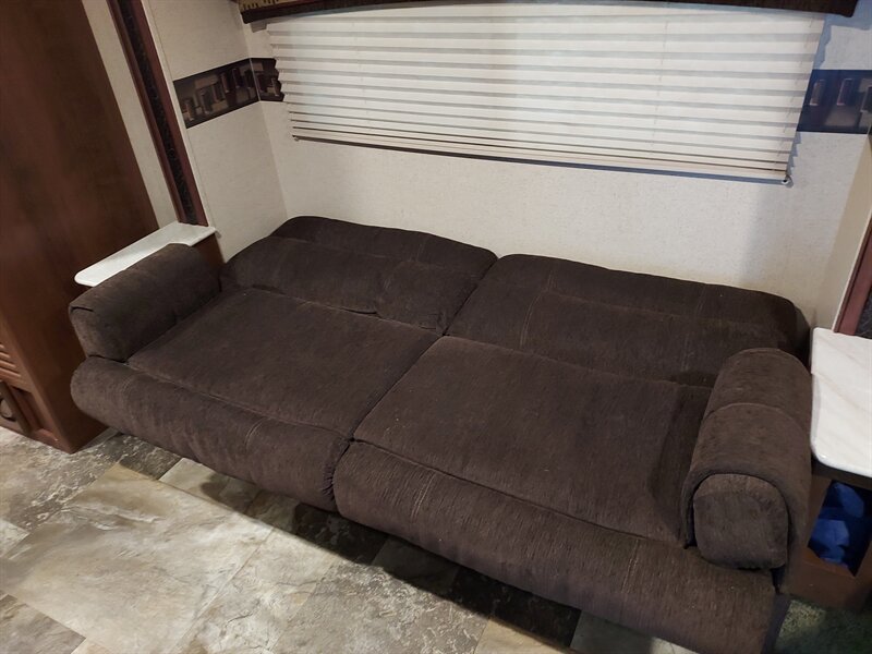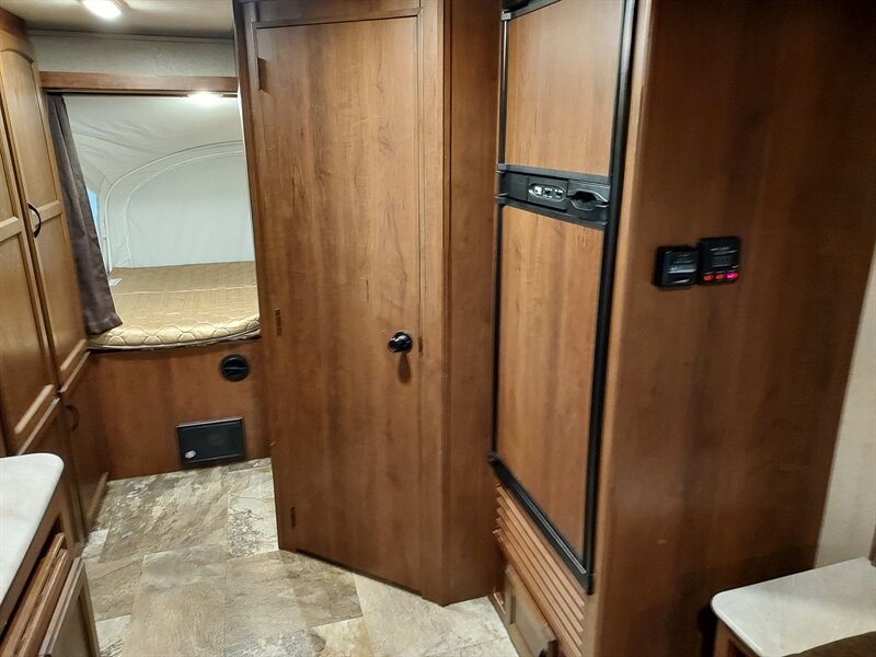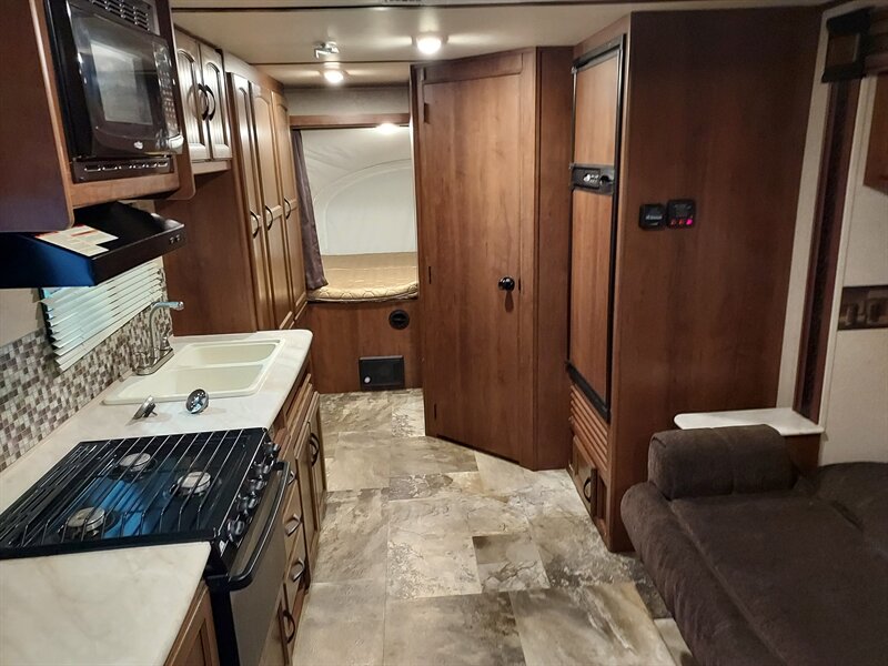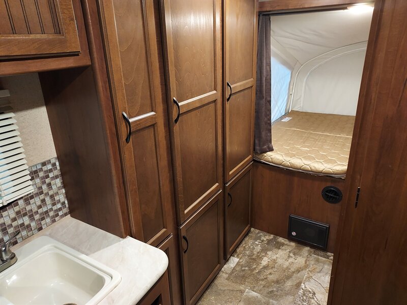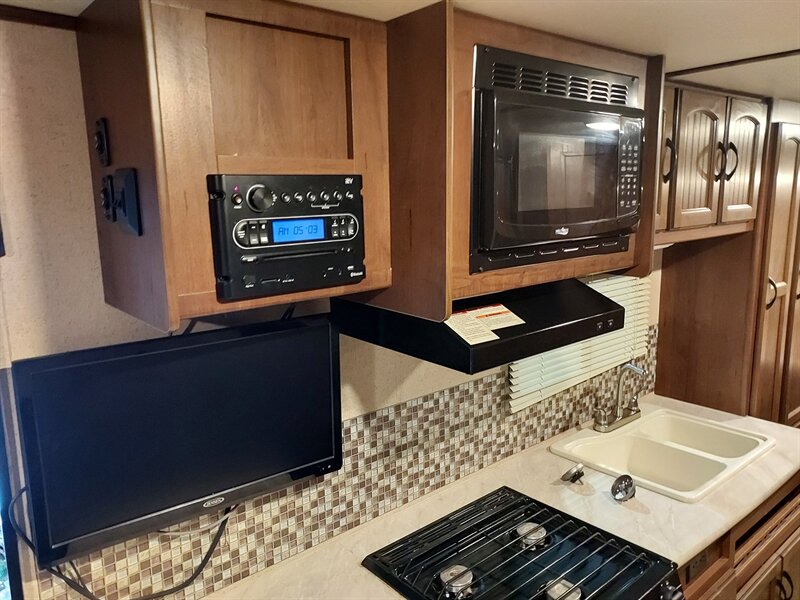 Inside, the Feather Light X23B boasts a well-thought-out layout that maximizes space. The living area includes a comfortable U-shaped dinette that converts into a sleeping area, accommodating additional guests. The kitchen is fully equipped with a three-burner range, a microwave, and a refrigerator, ensuring that meal preparation is both convenient and efficient. Ample storage is provided through overhead cabinets and pantry space.