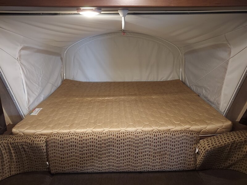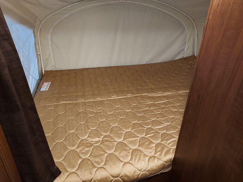 The trailer features two hybrid fold-out beds on either end, allowing for a cozy sleeping experience that combines the benefits of a traditional bed with the airy feel of a tent. Each bed is equipped with a privacy curtain, providing a comfortable and secluded sleeping environment.