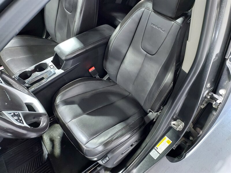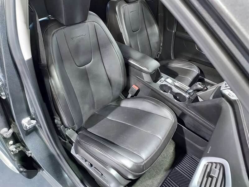 The exterior of the Terrain Denali showcases a sophisticated design, highlighted by its signature Denali grille, chrome accents, and unique 18-inch aluminum wheels. The compact SUV also features projector-beam headlights, LED daytime running lights, and a rear spoiler, enhancing its overall aesthetic appeal while providing improved visibility and safety.